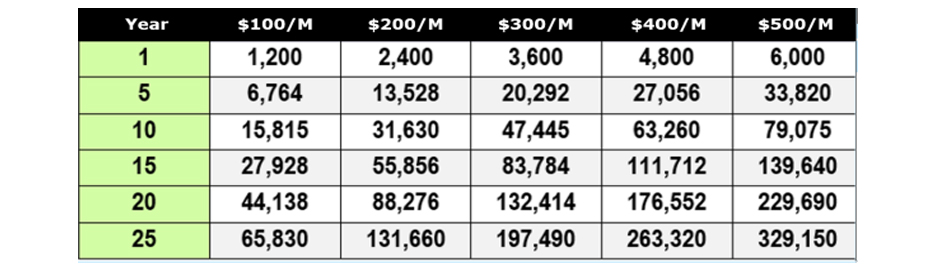 Artificial Grass can help you with substantial savings on your monthly water bills and maintenance costs, including landscaping, gardening work, and chemicals. The Savings Table below shows your potential savings based on $100/Month to $500/Month during the first 1 to 25 Years on cumulative basis assuming a 6% Annual Cost Escalation.
