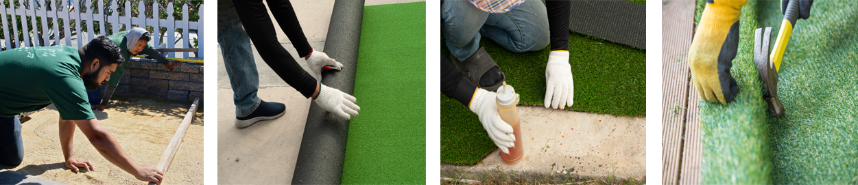 Artificial Grass is more than just the grass itself. It’s a complete Landscaping System which consists of several critical elements, including grass fiber, green top dressing, silica sand, leveling layer of crushed granite, base structure of crushed granite, geotextile fabric, and ground subgrade. The artificial grass installation process entails several steps as follows: