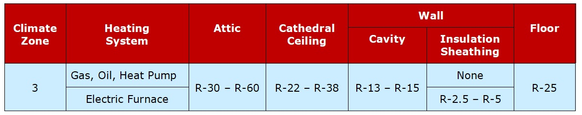 Homeowners in California belong to Climate Zone 3 and all relevant R-Values are presented below.