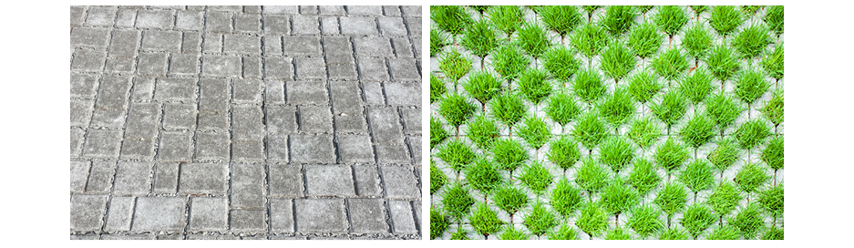 Consider installing Permeable Concrete Pavers for patios, driveways and walkways. The pavers are solid, but if they’re spaced correctly, water drains between them. Pavers are placed over a bed of sand or gravel, which filters water before it percolates into the soil.